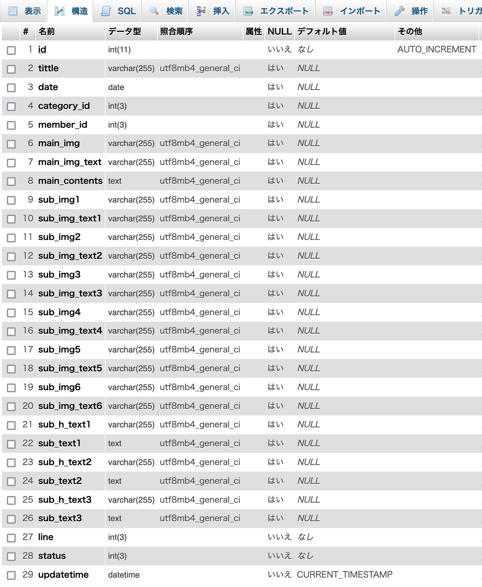 portfolioテーブル、memberテーブル、categoryテーブルを作成しました。